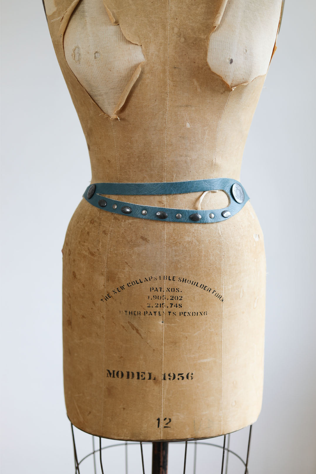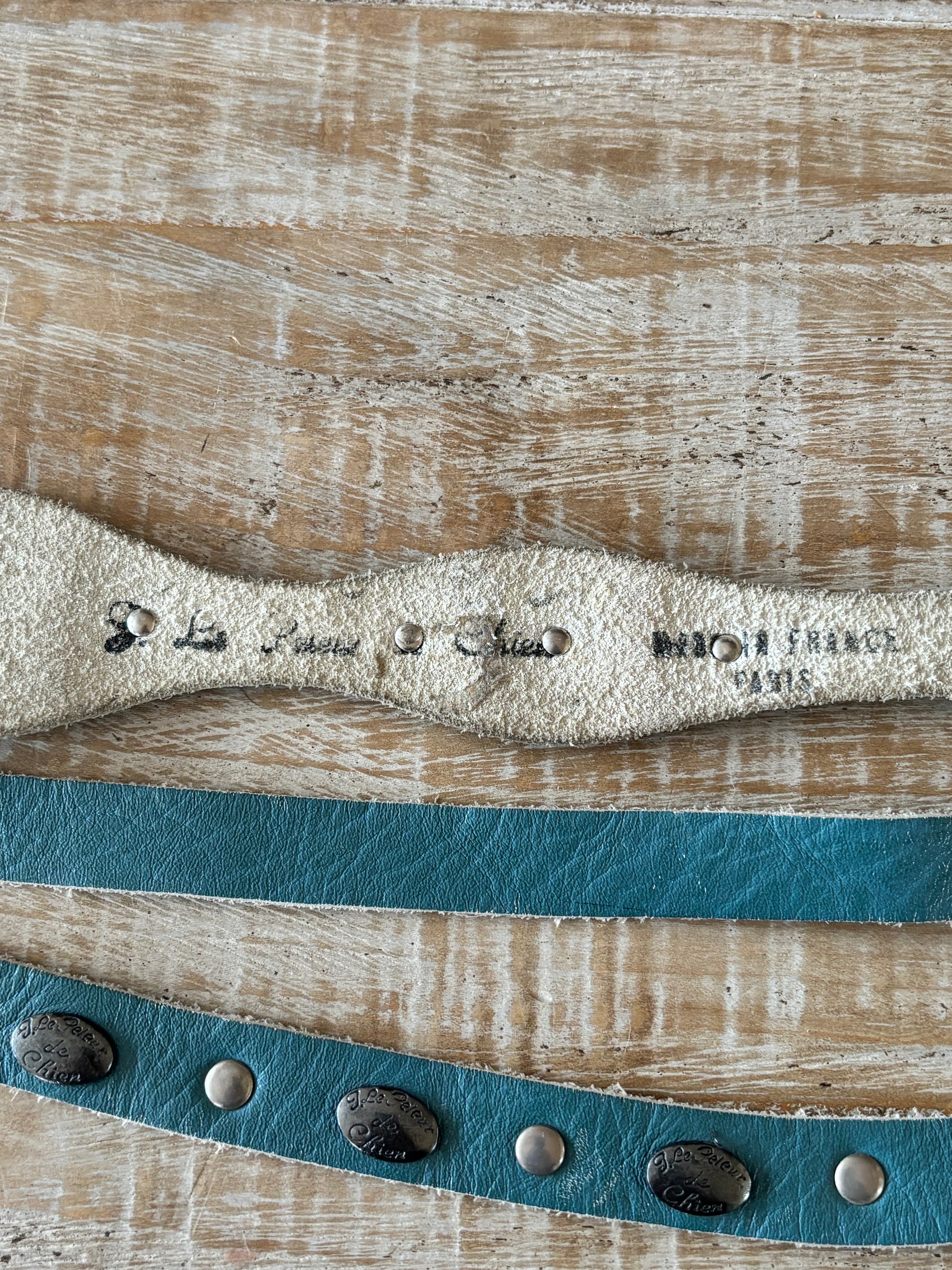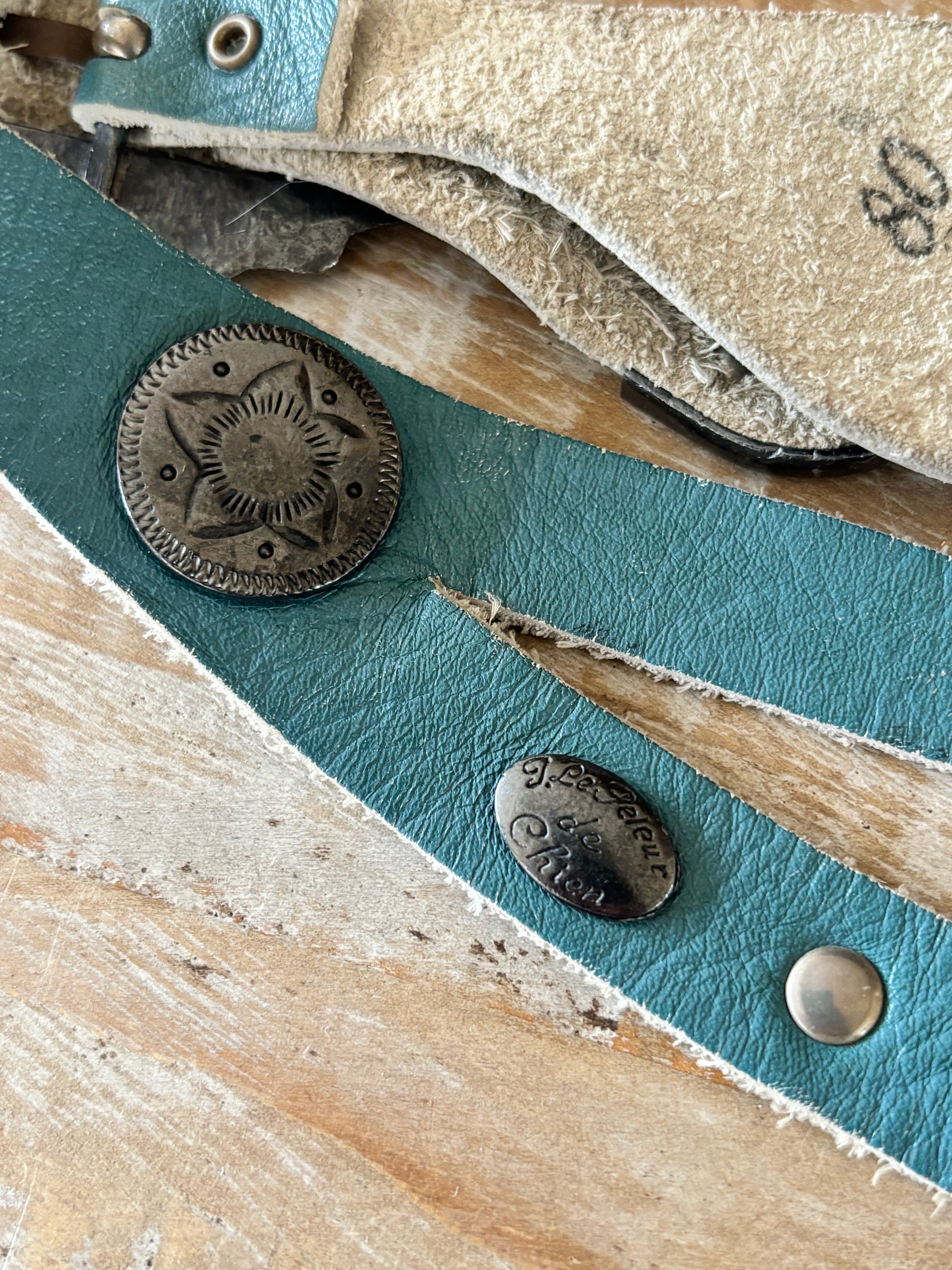 Gorgeous, designer-quality ca. 1980s Paris-made Boho-Western delphite blue leather + silver conchos + double-buckle cincher belt. Marked J. Le Peleur de Chien on both belt and the decorative logo studs used in design. Can be worn high or low, or reversed for a different look.