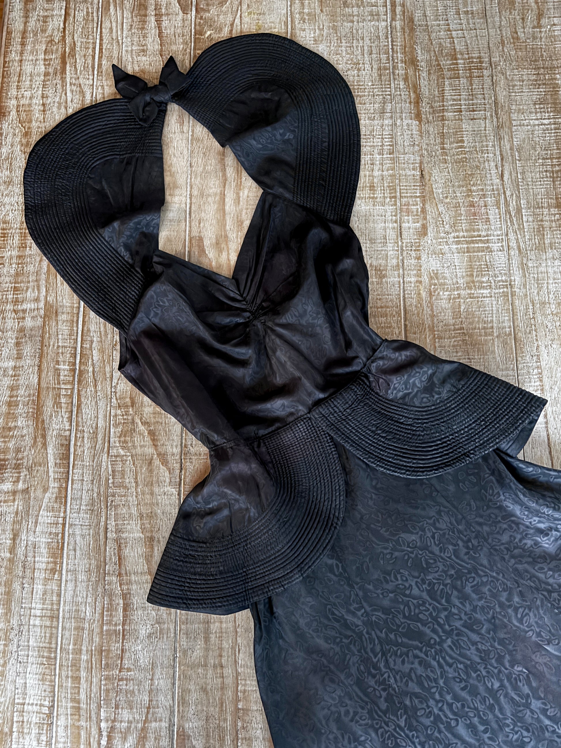 Vintage ca. late 1930s caped halter peplum evening gown in an amazing midnight "watery reflections" moiré taffeta. Absolutely phenomenal, just couldn't safely get it onto my dress form so relying on pinning and flat lay to try to depict how cool it is. Rear consists of slender straps with an open back; the trapunto-edged cape sits over shoulders, drawing together with a flat bow. Fabulous!