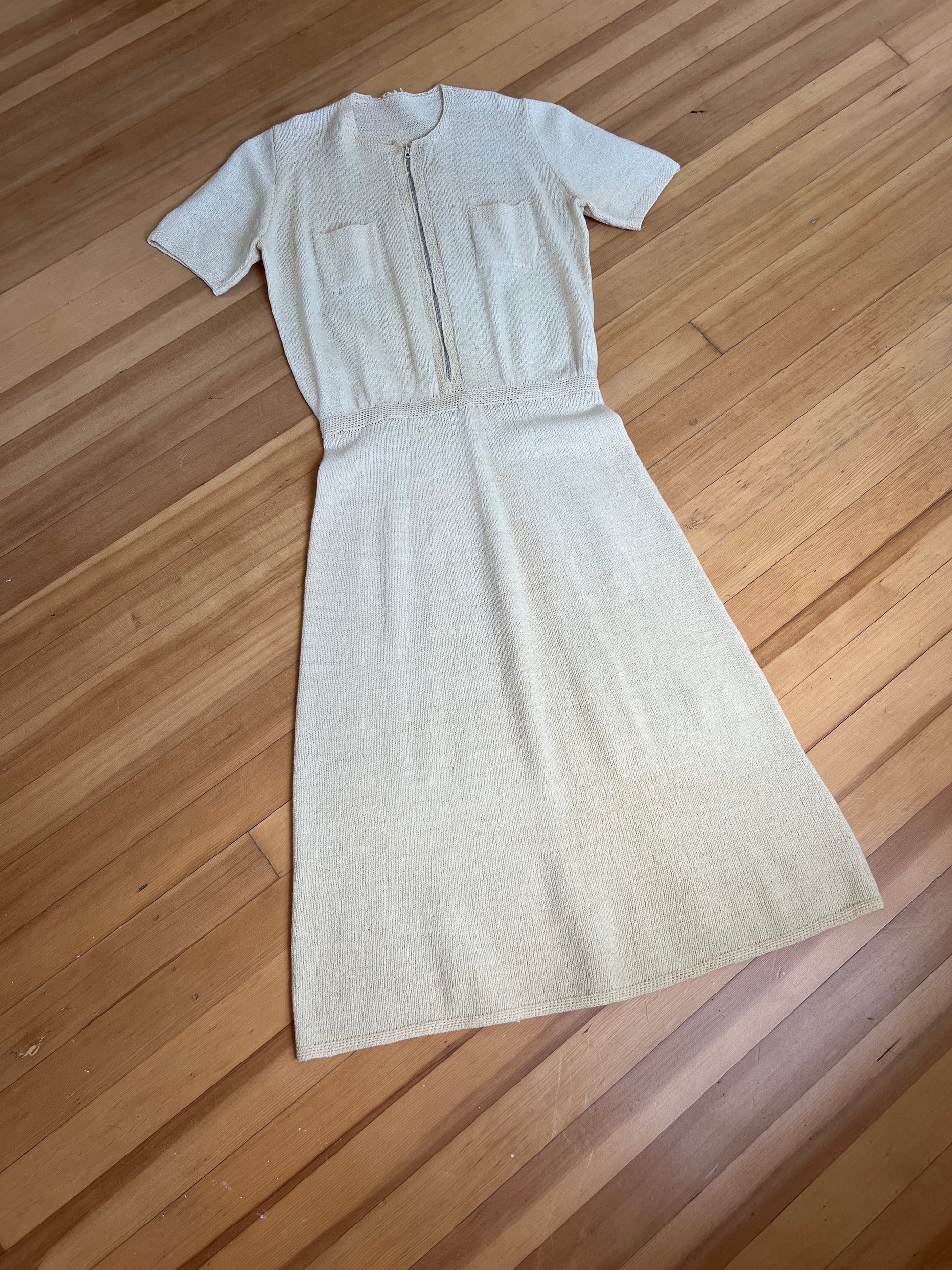 Darling wool knit late 30s/early 40s buttercream dress w front metal bell-pull zipper + twin bust pockets, hand-knit and one-of-a-kind!