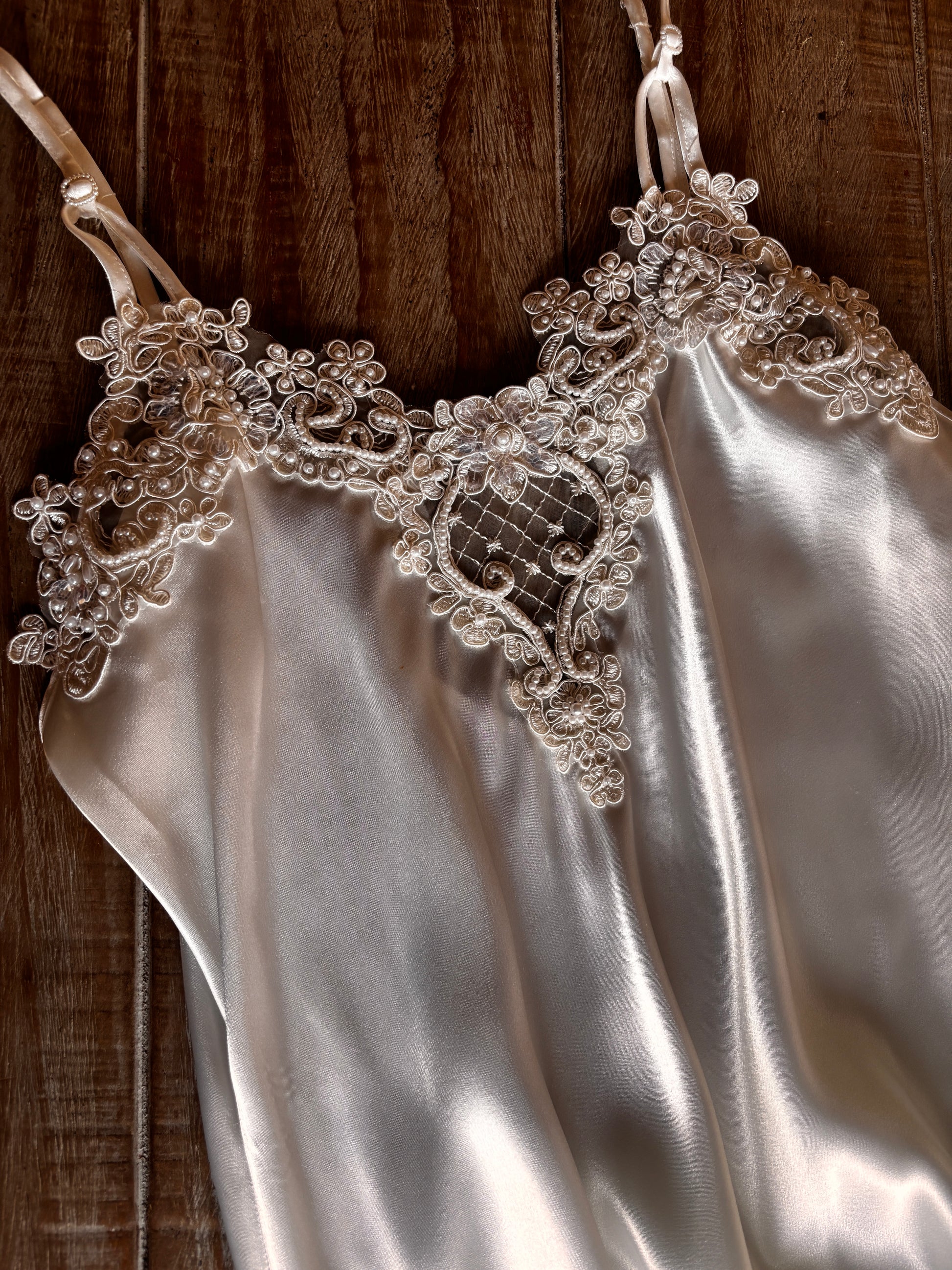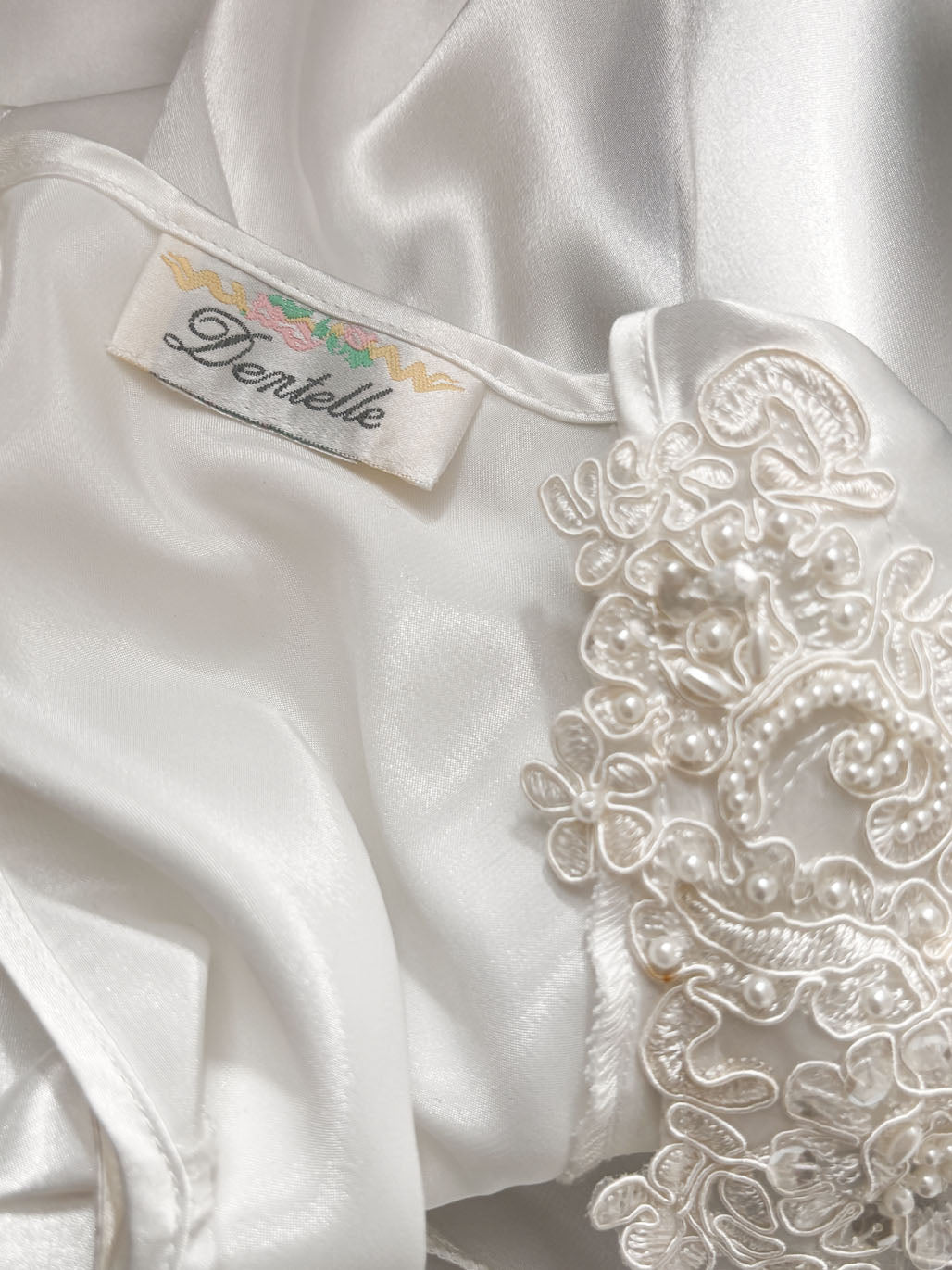 Discontinued 90s-Y2K glossy white nightgown by Dentelle -- their gowns currently retail for $500-700. Exquisite faux pearls, sequins, lace, mesh, and bow details throughout, with adjustable straps and a flounced hem of chiffon. Too beautiful to confine strictly to the boudoir, but perfectly nice in there, too.