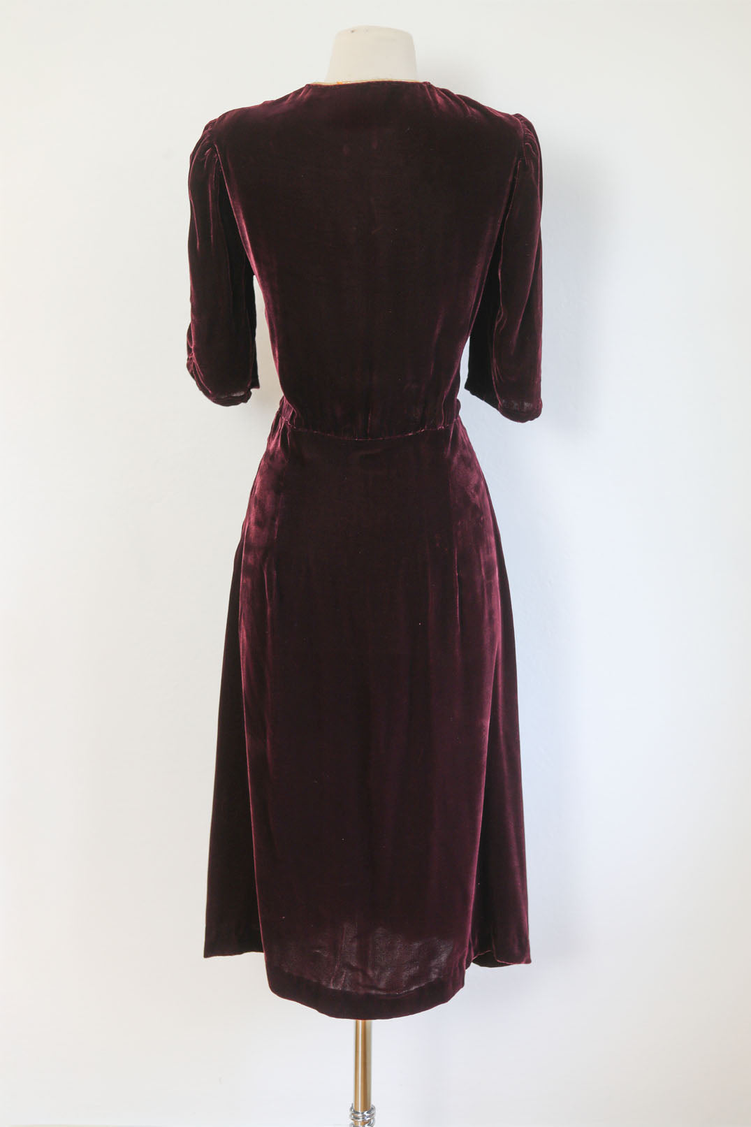 Vintage 1930s to 1940s Dress - Cherry Coke Wine Red Slinky Velvet w Ruching + Gilt Gold Size M to L