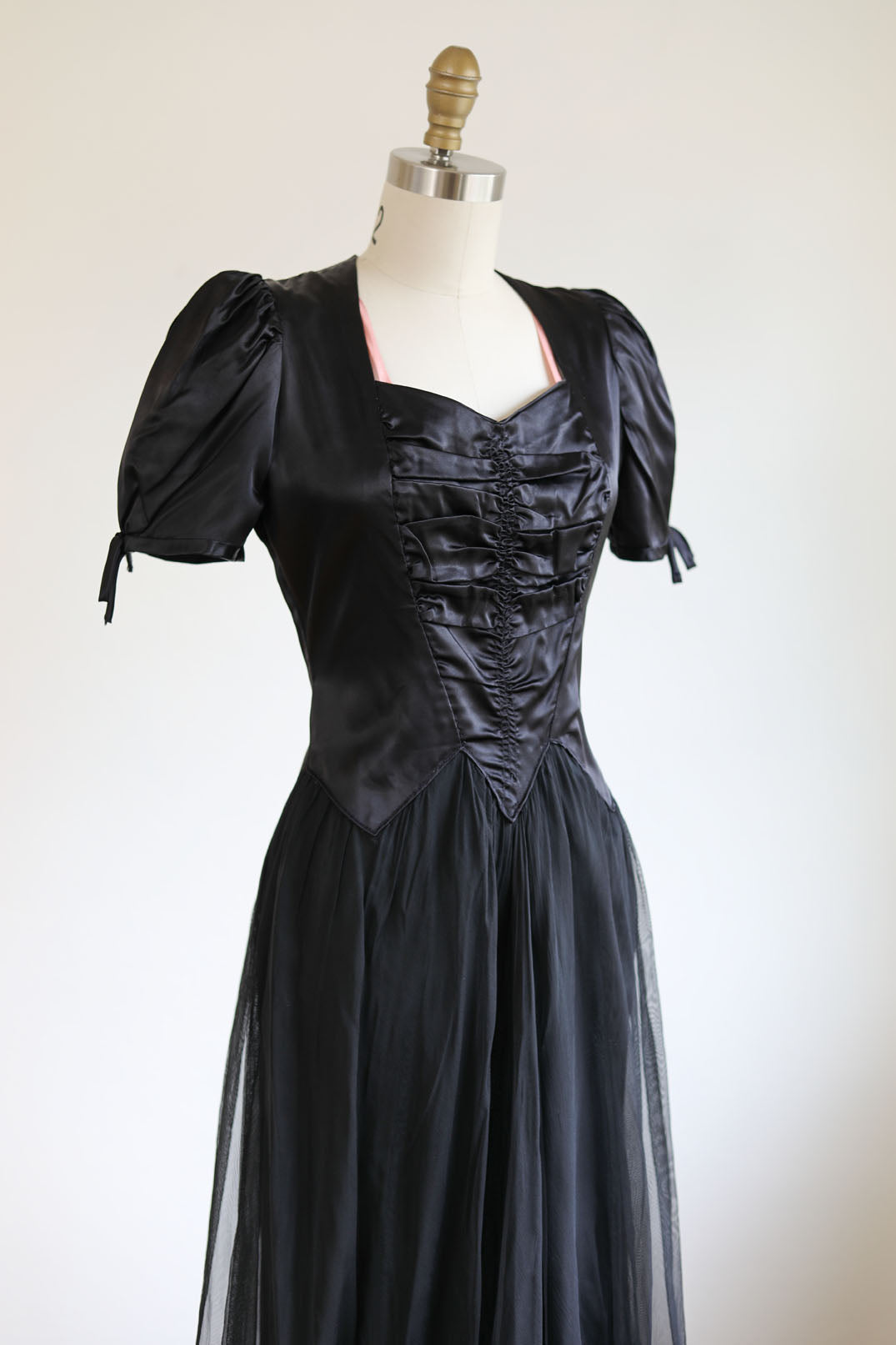 Vintage late 1930s to early 1940s cusper evening gown of black satin with structured puffed sleeves, a pink chemise layer, fanged points at the waist, and voluminous, sweeping net skirting like black smoke.