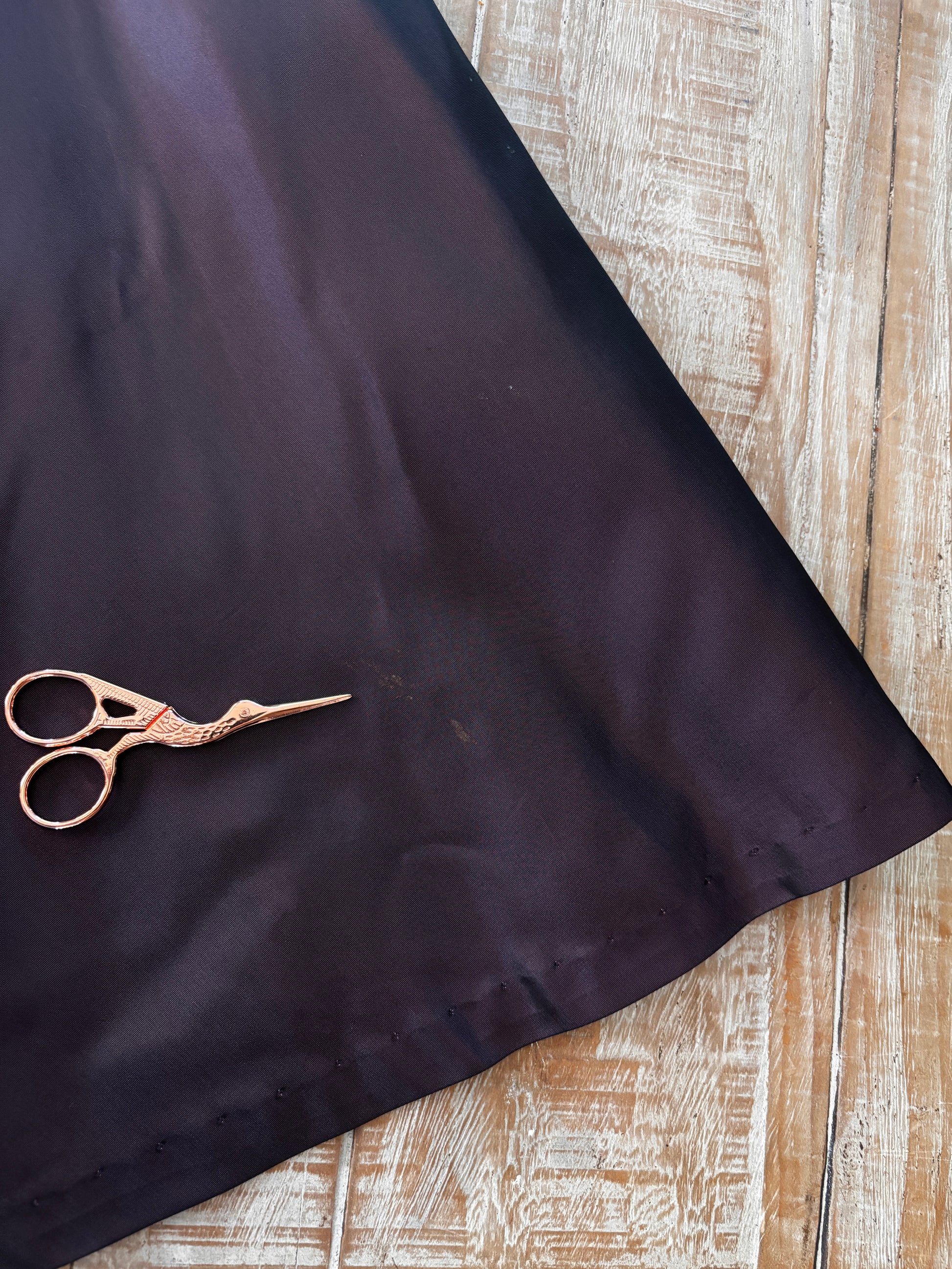 Regal and magnificent vintage late ca. 1940s/cusper era Baebro Original dress in a crisp silk taffeta of moody, glowing amethyst trimmed with autumnal silk velvet leaves + violet carnival glass vines and even more leaves. Well-padded shoulder, sweetheart neckline, notched cuffs, sweeping 4-gored skirt.