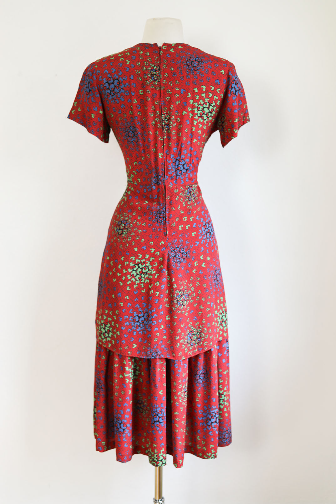 Vintage 1940s scarlet, blue, lime, black cold rayon crepe-finished dress, printed with dizzying deco geometrics. Tucked shoulders, delightful side swag, graceful peplum, sweeping hem.