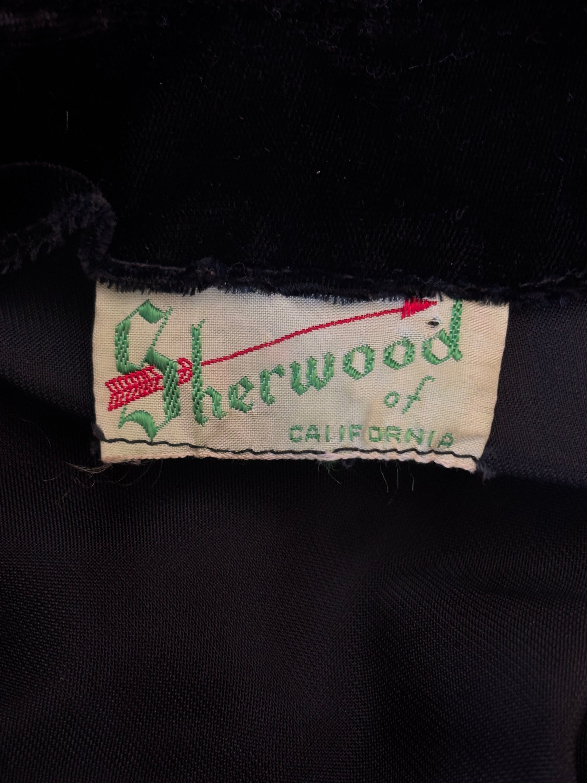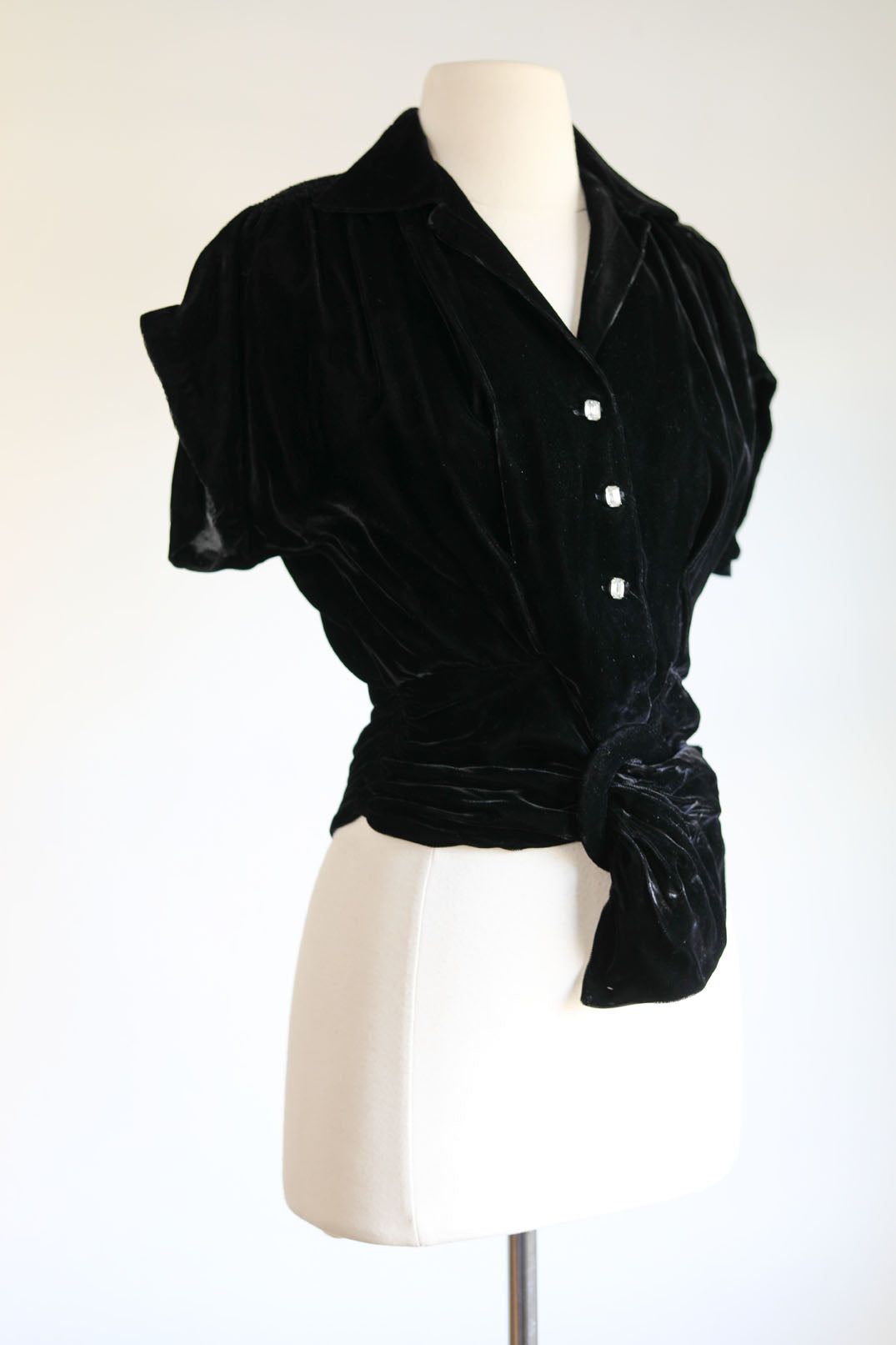 Vintage 1940s super-soft jet black velvet "Sherwood of California" blouse with capped sleeves, striking Venetian mirror-style glass buttons, ruched waist, belt buckle with sash. Wear over a skirt or wide-legged trousers, or make it modern by topping jeans. Difficult to photograph black velvet to do this showstopper proper justice!