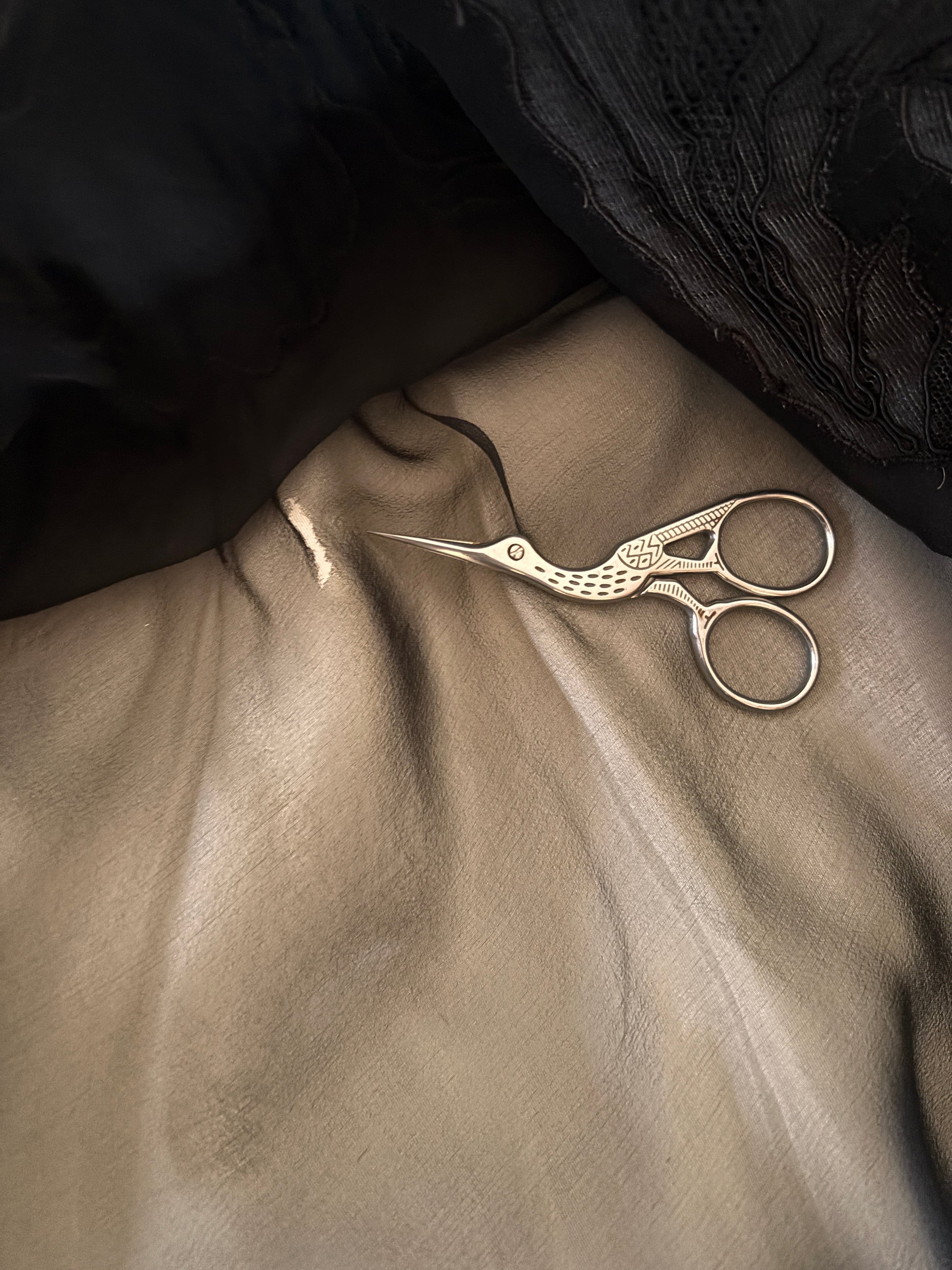 There's a short, clean tear in the second-in layer of black chiffon at side skirt near waist seam. Not easy to see due to the quadruple-layering of skirt; can be left alone, but a mend would be nearly invisible.