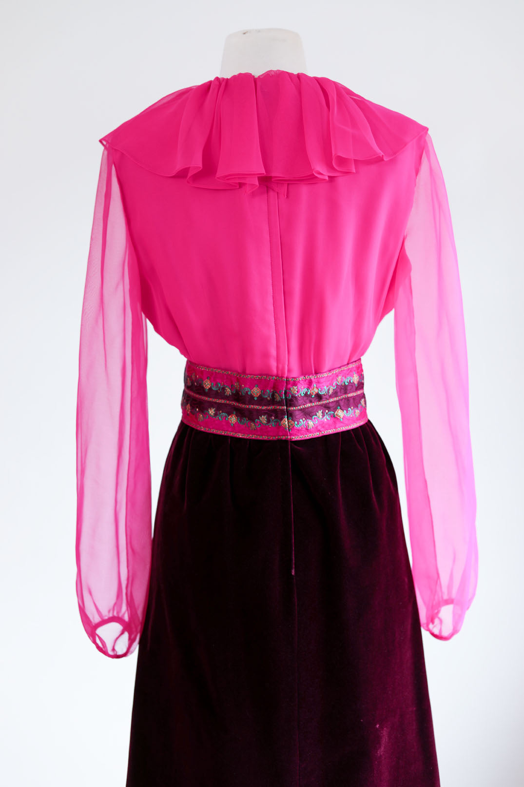Vintage 1960s Designer Cocktail Set - Jaw-dropping Wine + Hot Pink Jabot Velvet + Satin Dress + Puff Jacket Size M