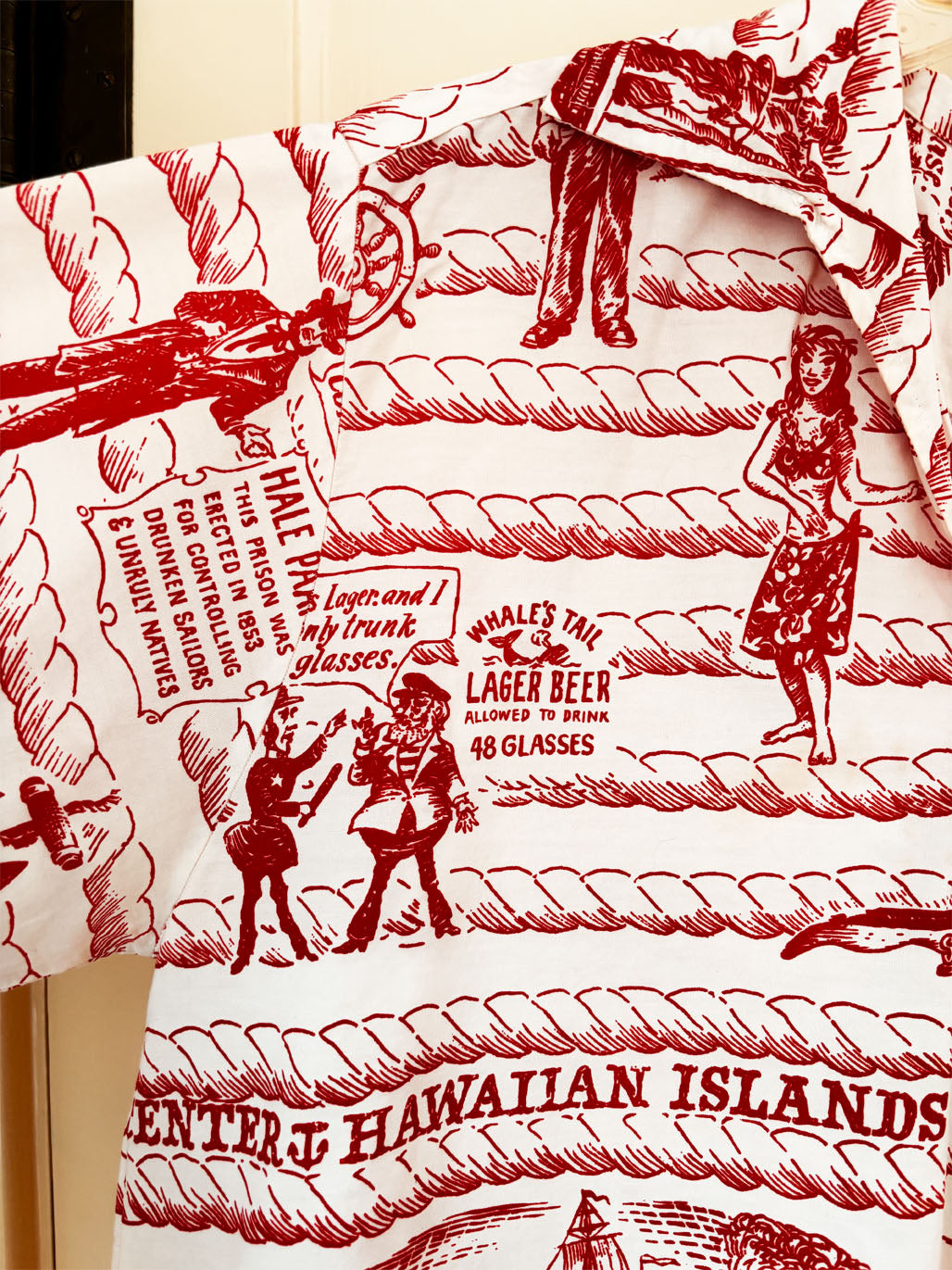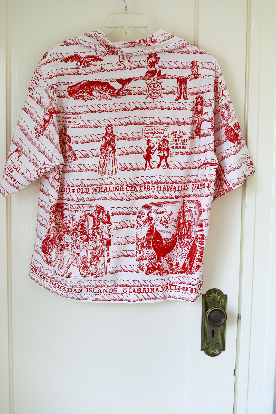 RARE ca. 1950s to 1960s cusper (ca. 1961) red/white Mildred's of Hawaii men's cotton button-loop pullover shirt with a very rare Lahaina, Maui "Old Whaling Center" print.