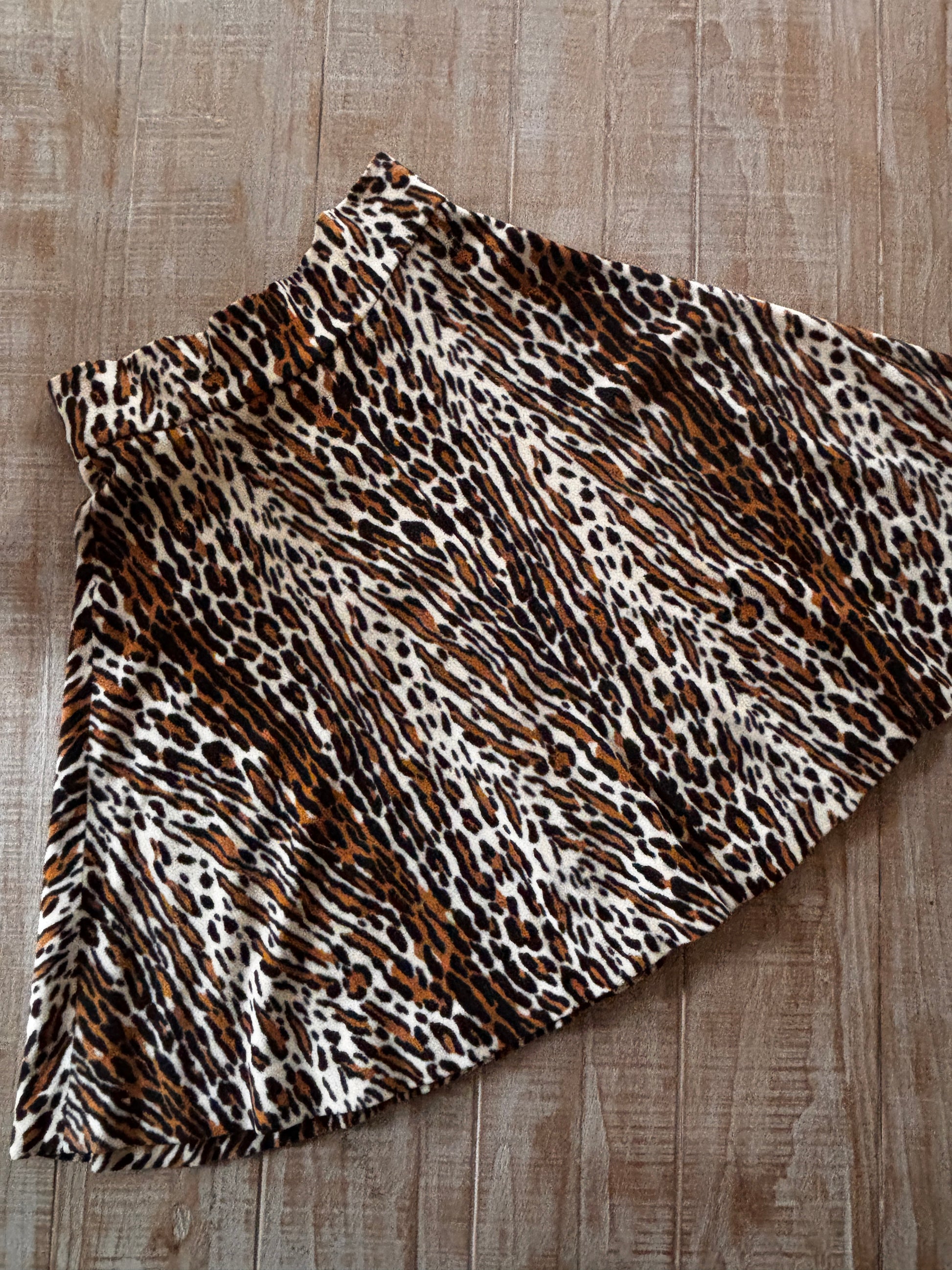 1960s vintage high-waisted flared mini skirt with front buttons in a rare leopard print faux fur.