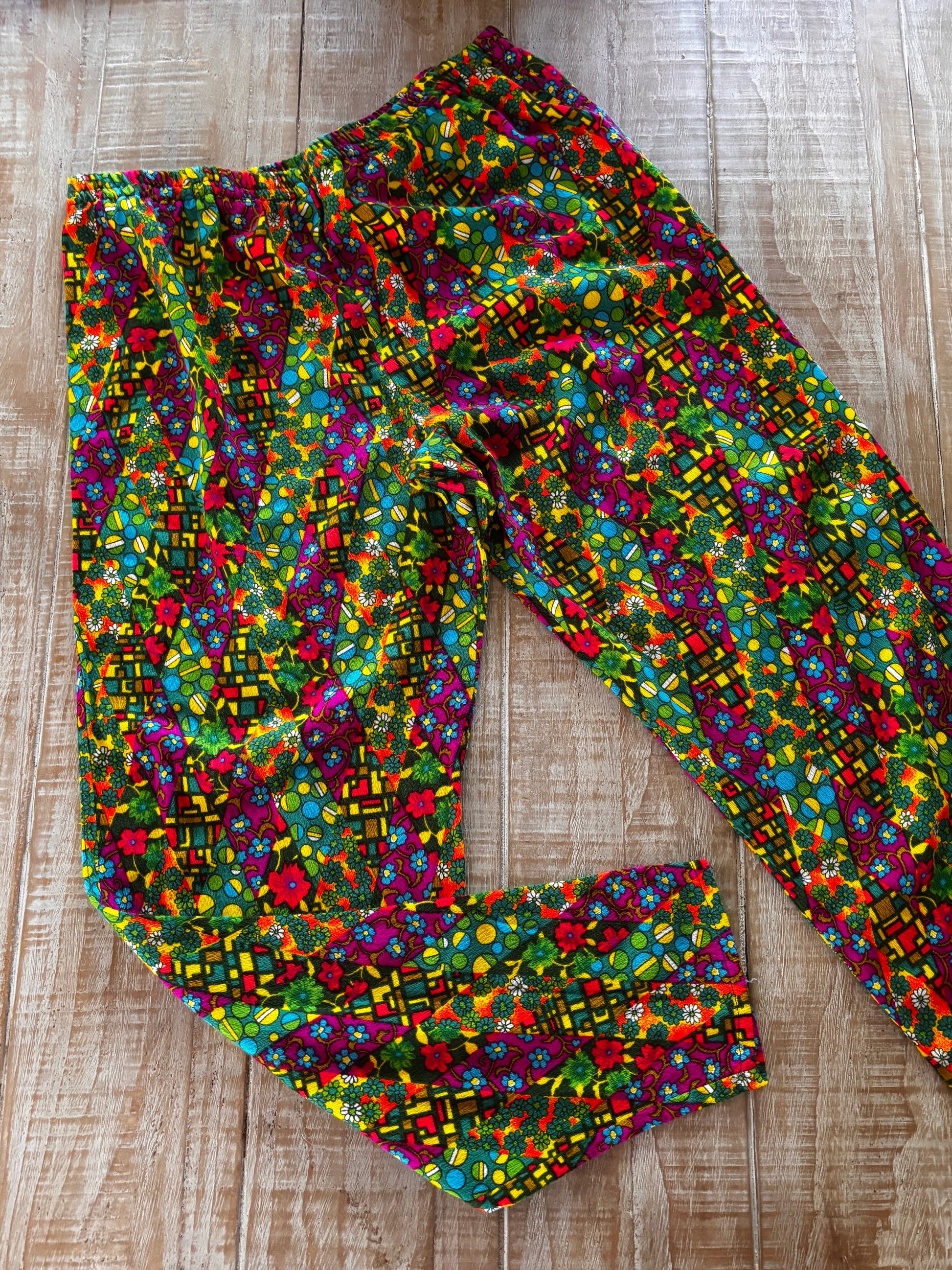 Wonderful and rare vintage 1960s pant suit by Cooooo Collection consisting of a top with metal zipper to the neck + a pair of sculpted cigarette pants, all of the era's version of barkcloth (thinner, softer) and in the wildest acid neon psychedelic print. Wear together, wear apart!