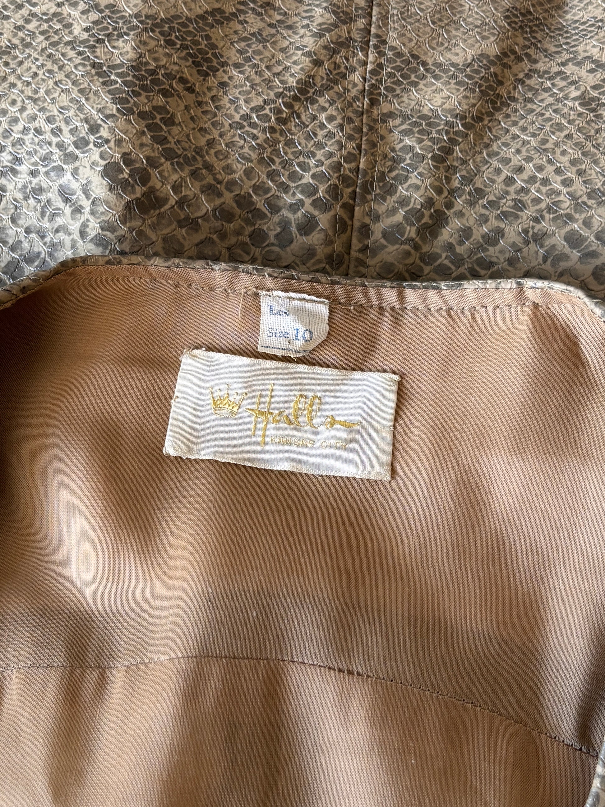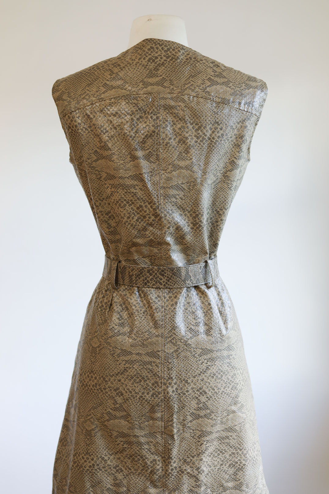 Smokin' hot vintage mod 1960s designer mini dress in a snakeskin-printed and -textured vinyl, lined with honey-colored gauze. Sexy front zip, original mini length, chrome-buckled belt. Layers up well, too!