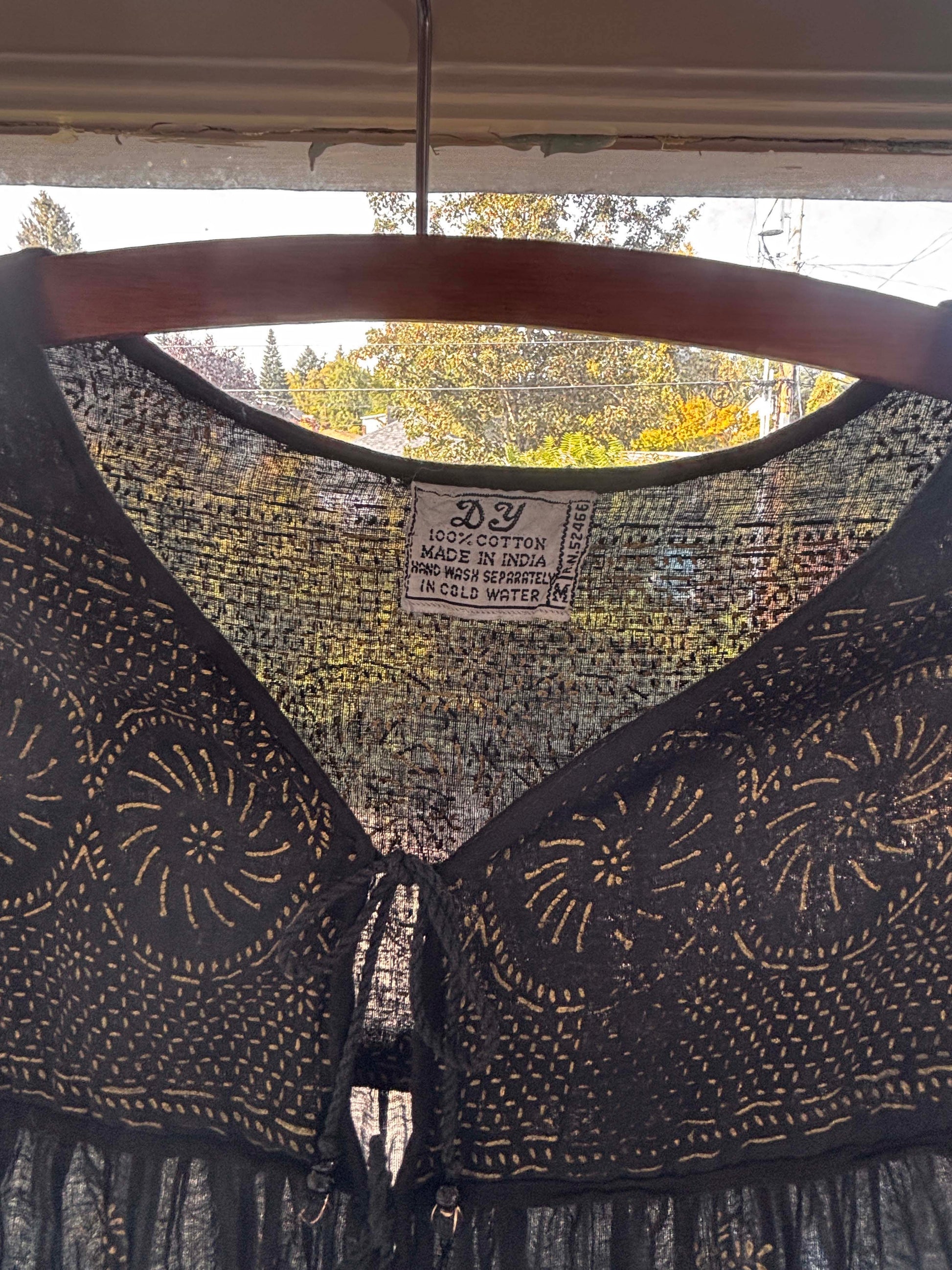 Rare black vintage 1970s Indian cotton gauze tunic gown by DY Made in India, crafted of a flowing, super soft border print with accents in hand-stamped gold metallics. Beaded ties at the yoke, sweeping skirt. Wear unbelted or belt for a different look.