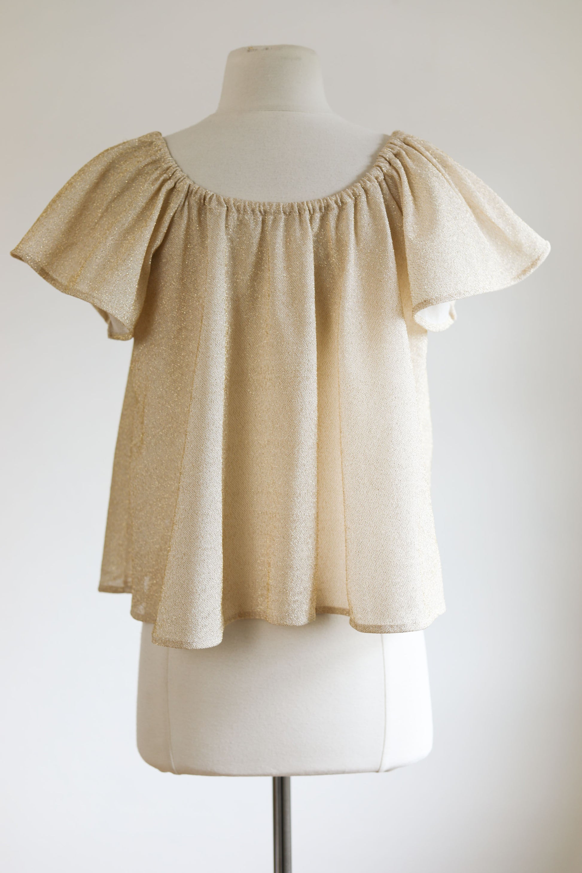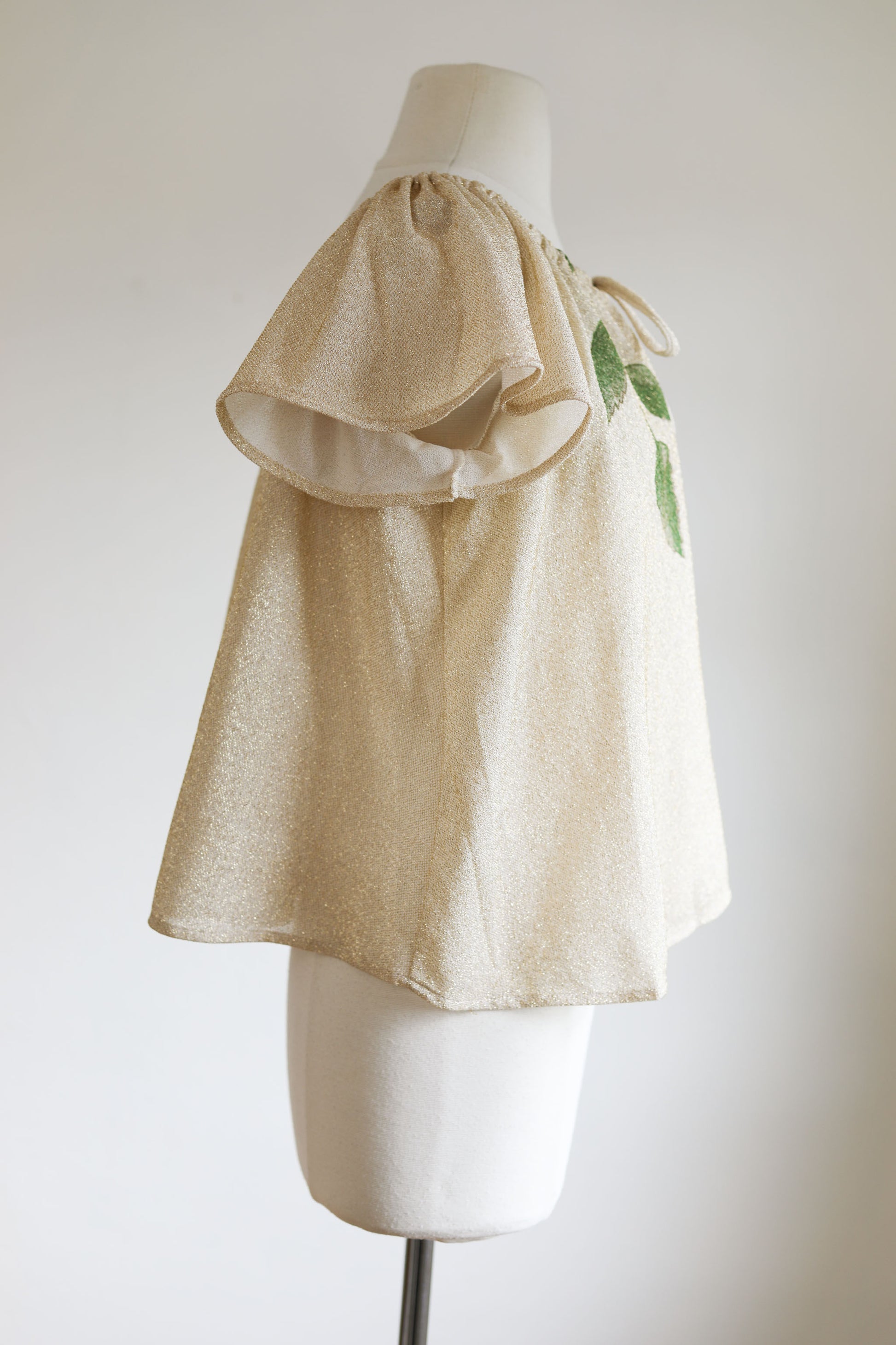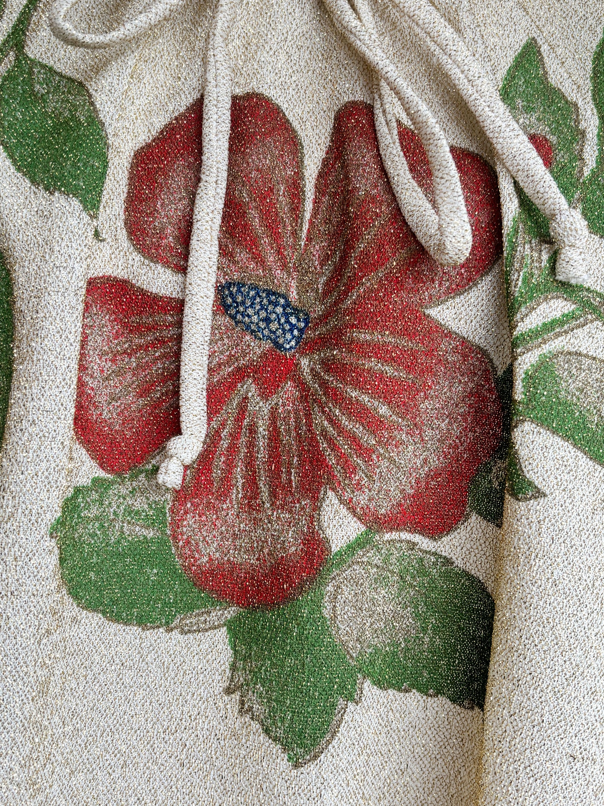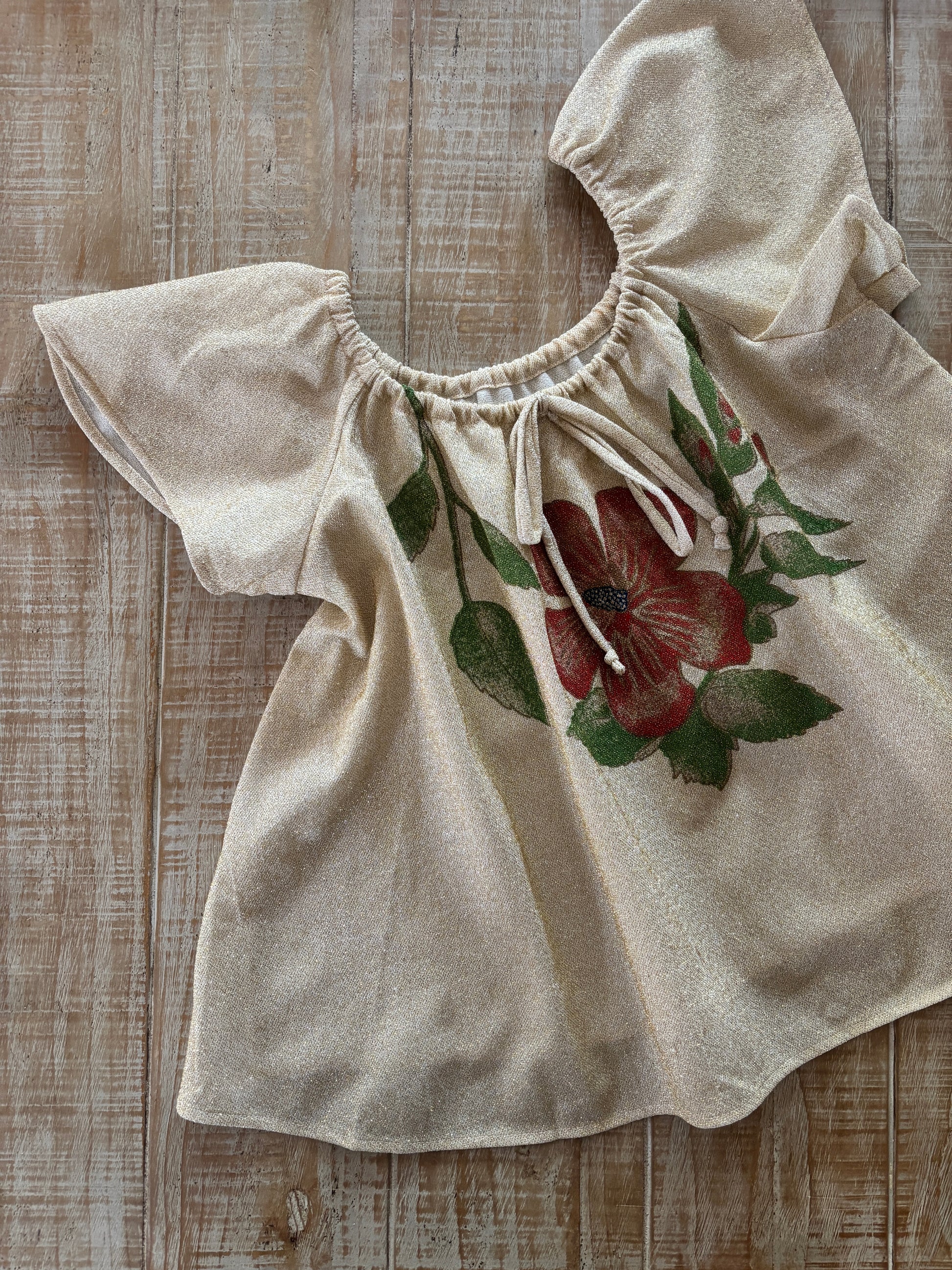 Sparkling little vintage 1970s blouse “made right in the USA” by Land-n-Sea, featuring a hand-screened brick red and olive hibiscus blossom. Subtle gold Lurex shimmer throughout, drawstring neckline can be worn on/off shoulders, flutter sleeves, easy-going trapeze cut.