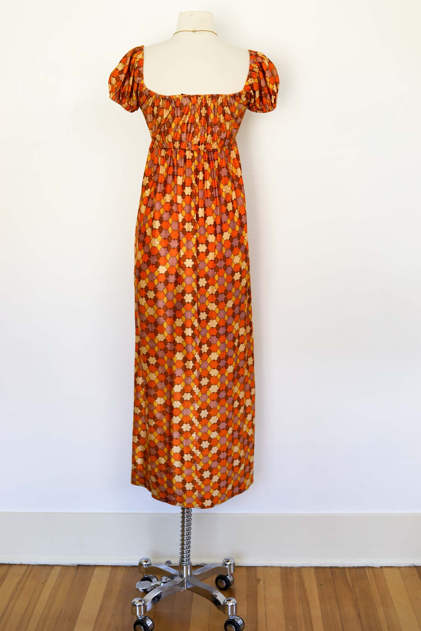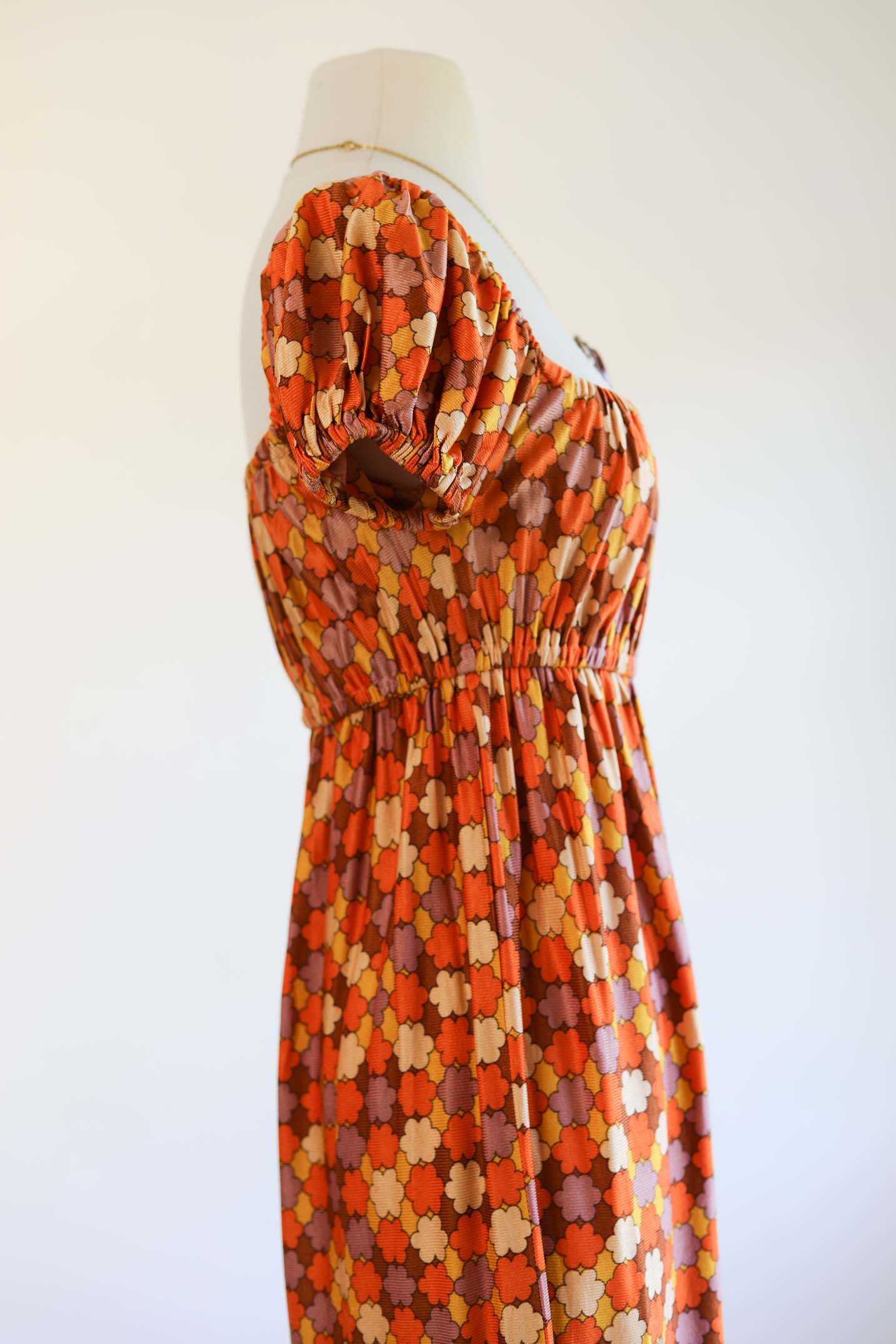 Slinky-soft vintage 1970s maxi dress by Joy Stevens of California in jersey of orange, mustard, and toast with a mod floral pop print. Fits essentially like a stretchy tube top through bodice, with cute on/off shoulder puff sleeves and a flowing skirt.
