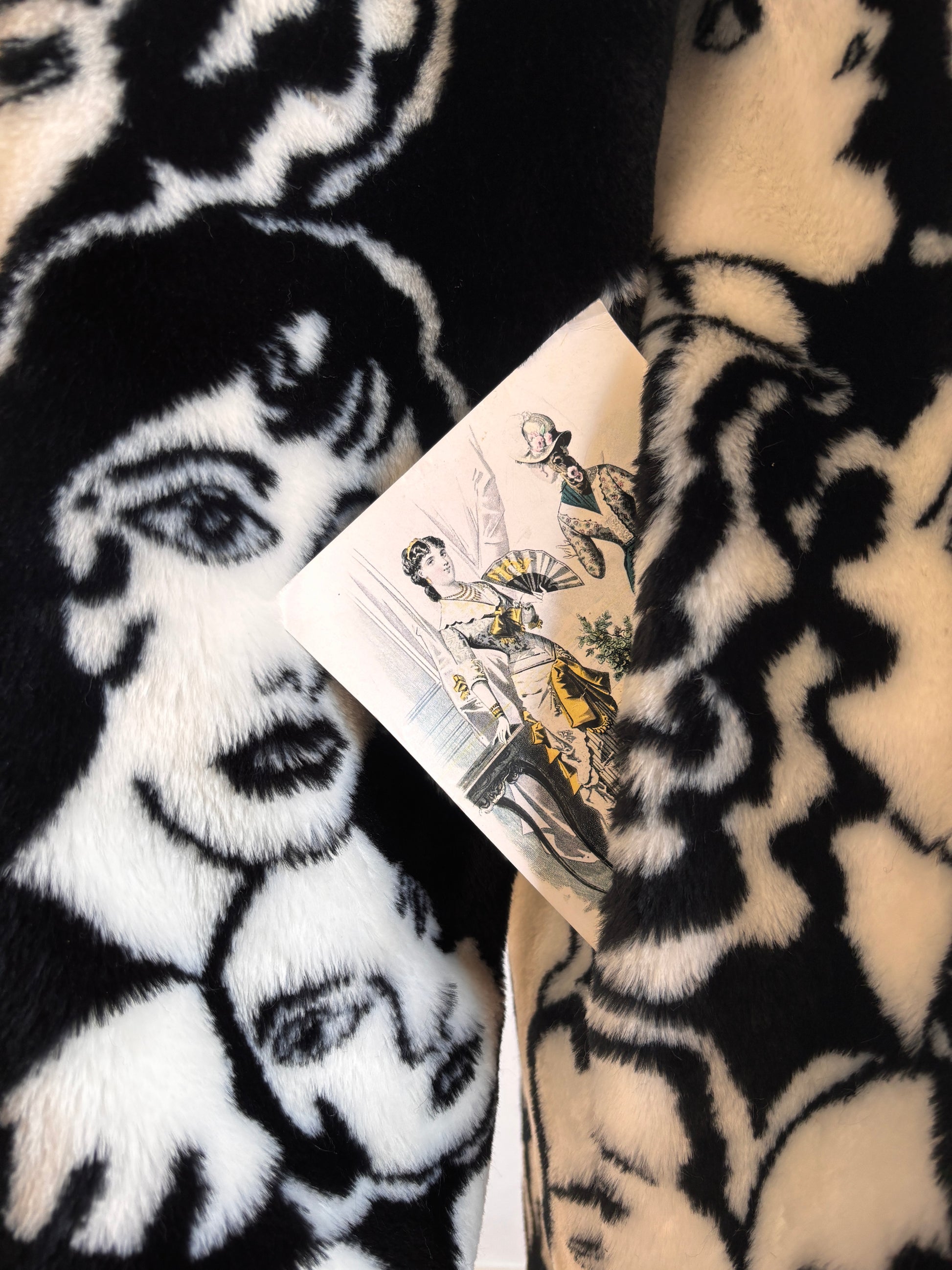 Vintage 1980s RARE Novelty Print Coat - Black White Deco Faces New Wave Faux Fur Teddy Coat Size XS S M