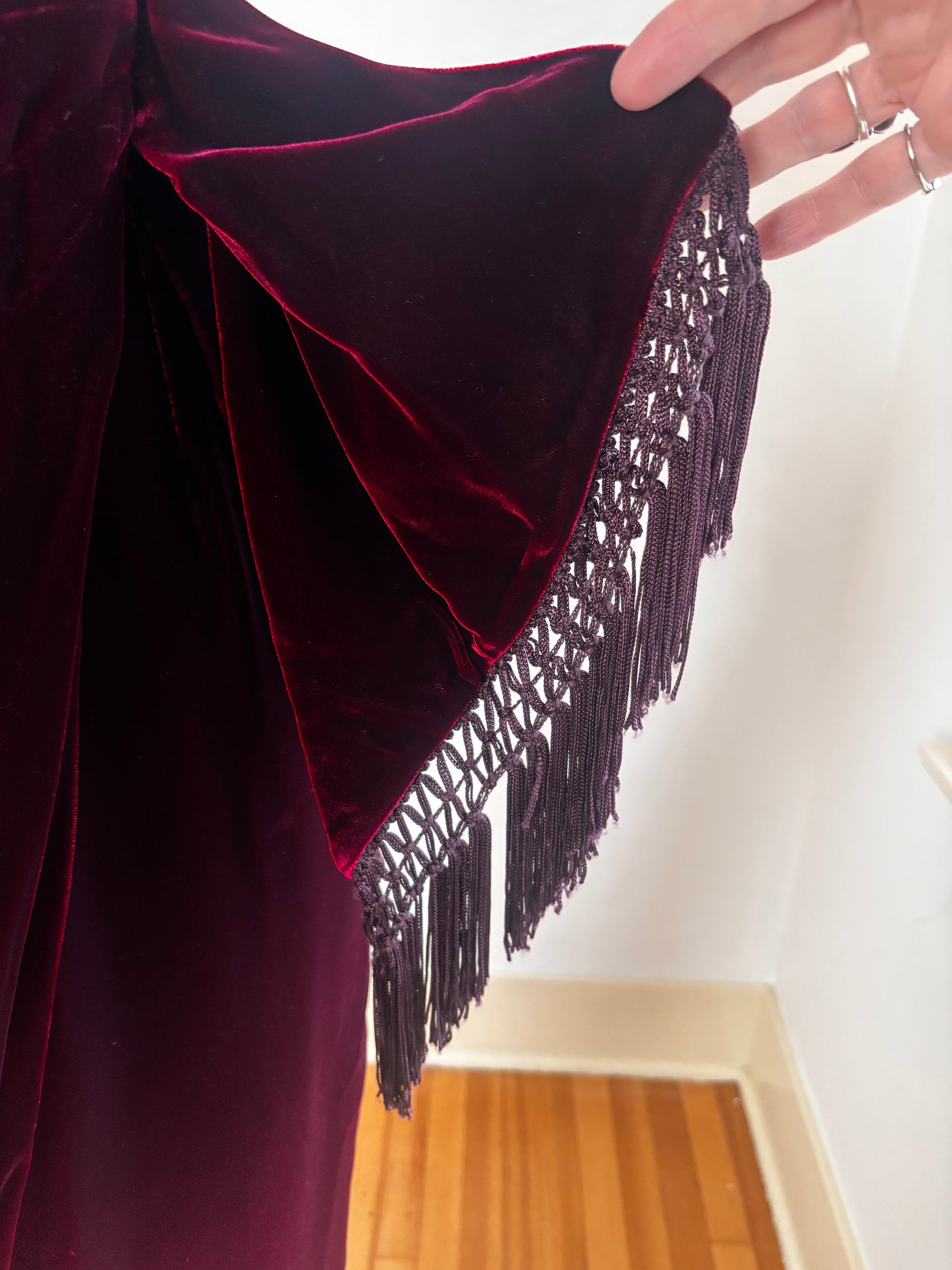 An absolutely exquisite ca. 1990s sarong style wrap halter dress of sinfully-soft wine red velvet. Features halter neck with taffeta button, curve-seamed bust, boned bodice, and a true wrap skirt, its lavish hip swag dripping with femme fatale fringe. The construction and quality both deliver the goods; dress is fully lined in glossy-soft satin, and features old skool large silky dressmaking snaps to firmly secure the wrap design. The sumptuous, glowing velvet and the fringe look and feel identical to older materials from the 40s - 50s.