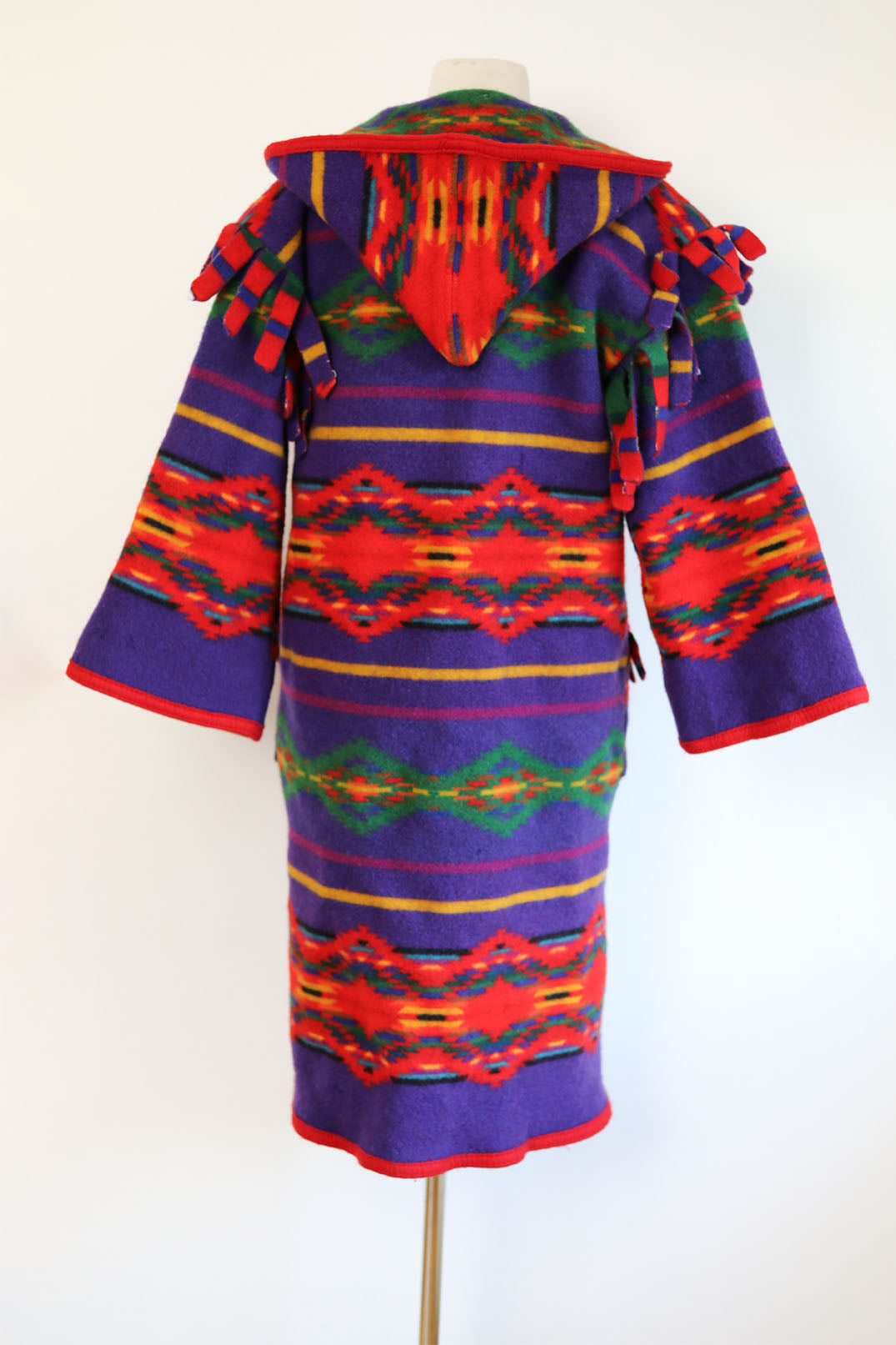 RARE vintage coat made from two different color ways of the same Pendleton Beaver State (pre-1972) blankets. Amazingly saturated colors, unisex clutch style, HOODED, both sides with pockets, one side with fringe! No labels but documented Pendleton wool as shown -- possibly a custom make, guessing 60s/70s.