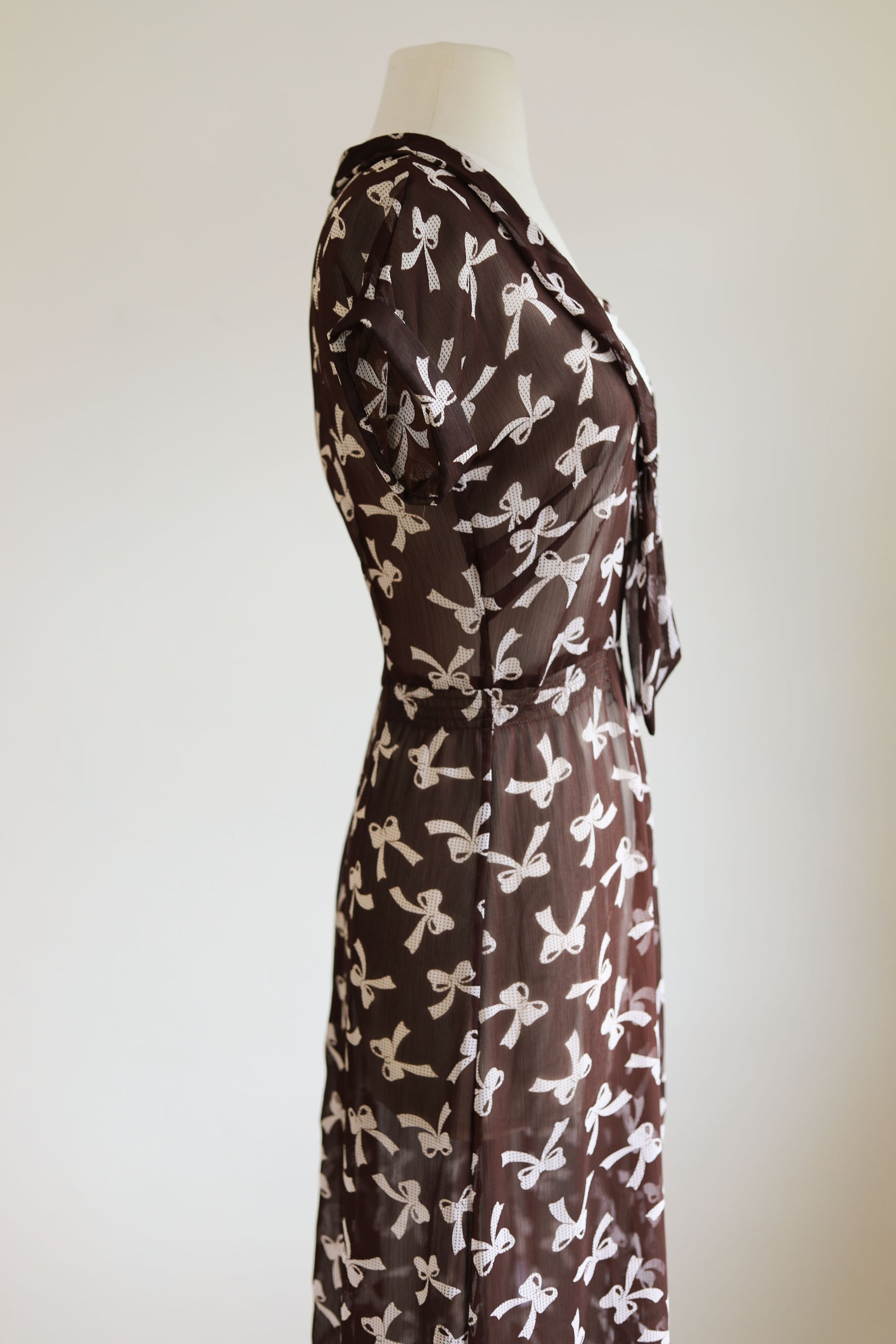 Vintage reproduction 1940s dress, produced by the Bettie Page, Las Vegas dress company sometime between 2006 and 2014 (and long-discontinued). Sheer cocoa-colored chiffon fabric, a whimsical novelty polka-dotted bow print, and contrasting white pleated “dickie” inset. The elastic smocked panels nicely define the waist without constricting it. Comfy, sturdy, and super charming!